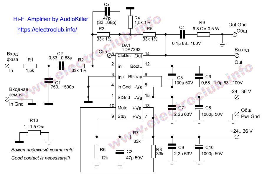 Схема Hi-Fi усилителя на микросхеме TDA7293 (TDA7294) показана на рисунке. Конденсатор Cx не имеет порядкового номера. Это сделано для совместимости с самодельной печатной платой: я добавил конденсатор Cx позже.