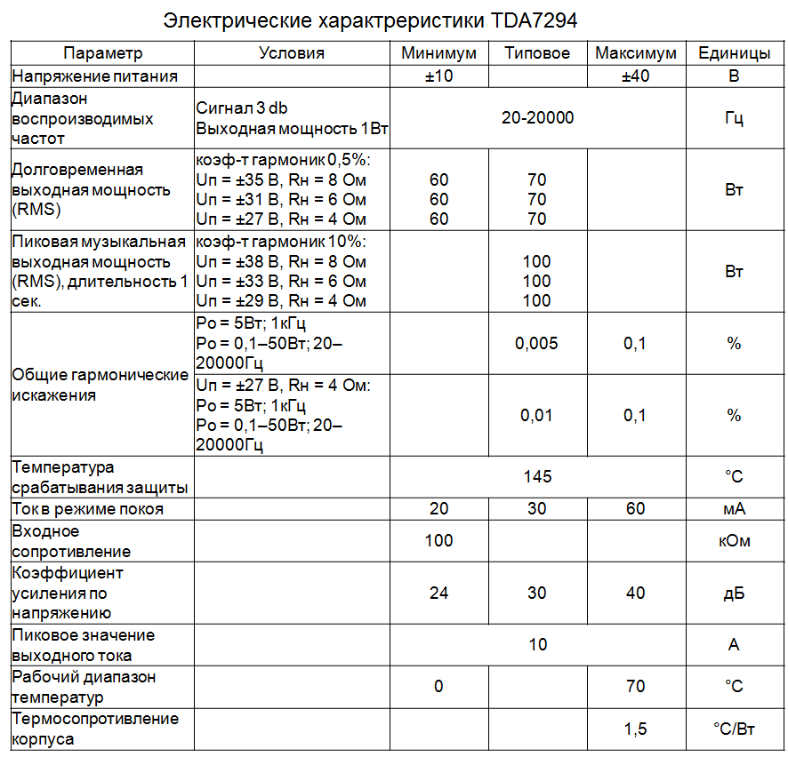 Технические характеристики TDA7294 позволяют получить максимальную мощность до 100 Вт, при сопротивлении в цепи нагрузки от 4 до 8 Ом. Этому способствуют полевые транзисторы, установленные в её предварительном и выходном каскадах. Устройство славится низким уровнем собственных искажений и шумов, работает в широком диапазоне частот и питающих напряжений.