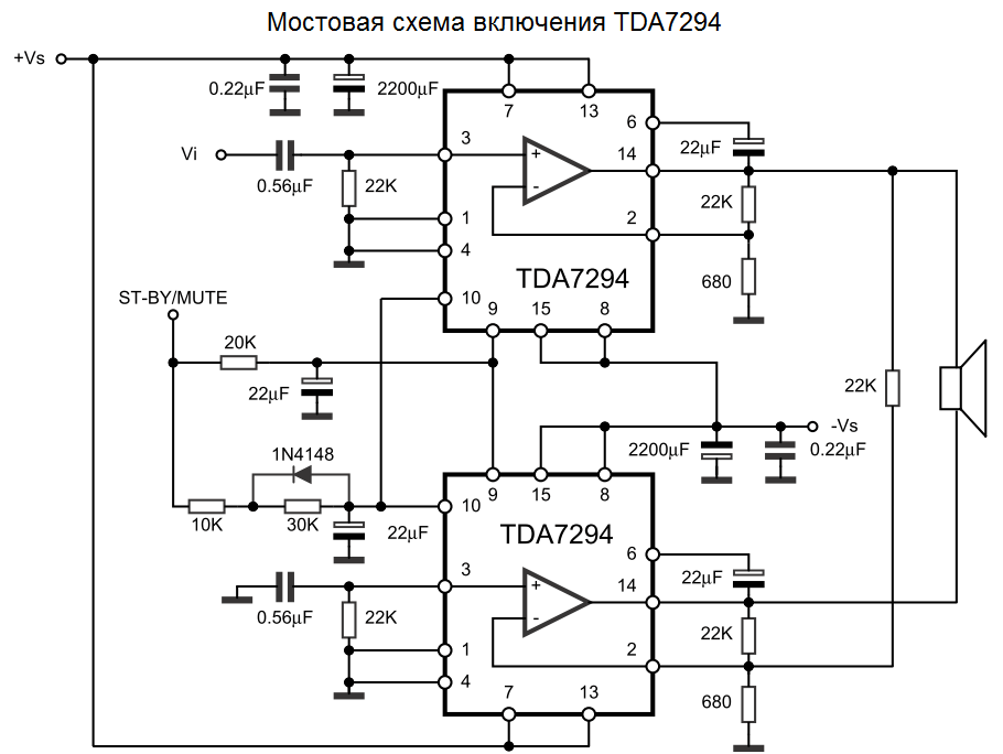 Типовую схему включения на tda7294 можно взять из технического описания в datasheet. Контакты VM и VSBY подключают к положительному выводу +VS. Если питание на них отсутствует или меньше 1,5 В – устройство выключено. В случае увеличения напряжения более 3,5 В микросхема выходит из энергосберегающего состояния (StandBy) и тихого режима (Mute).