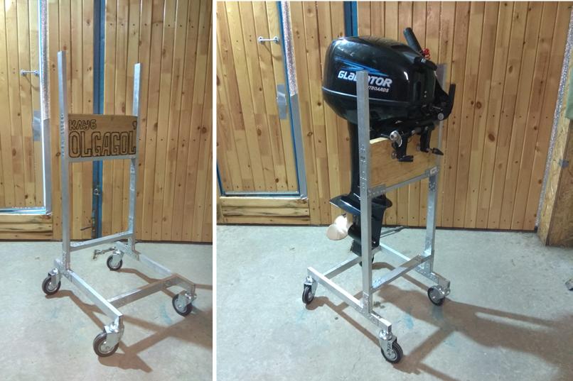Основным составными частями данного простого, но в то же время надежного транспортного приспособления для подвесного двигателя плавсредства являются: