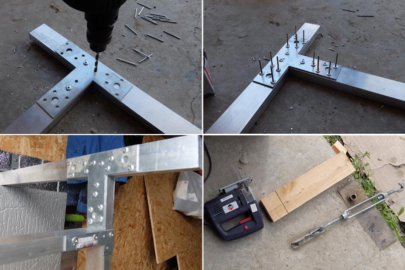 Детали каркаса вырезаются из алюминиевой трубы. Монтаж производится с помощью стальных элементов, соответствующих размеру профиля. Сначала сверлятся отверстия, соответствующие диаметру заклепок, затем устанавливаются последние с помощью заклепочника.