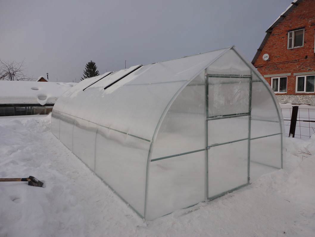 - Покрытие теплицы не нуждается зимой в регулярном удалении снежной массы. Каплевидная форма не позволяет снегу задерживаться на покрытии.