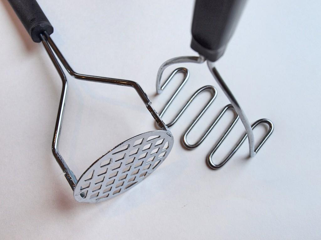 Толкушка – простейший инструмент, который есть в любом хозяйстве. Он вполне справляется с задачей разделения набухших глобул крахмала. Но из-за того, что толкушка попадает на одно и то же место несколько раз, часть глобул лопается, и крахмал высвобождается. В результате пюре может получиться чуть «затянутым». Преимущество: доступный инструмент, хороший результат. Недостаток: сложно и неудобно приготовить большой объём действительно пышного пюре.