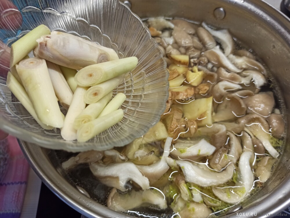 - Почистить лимонную траву, разрезав ее на куски. Опустить ее вместе с листьями кафир-лайма, лука и грибами в бульон. Оставить минут на пять вариться на медленном огне.