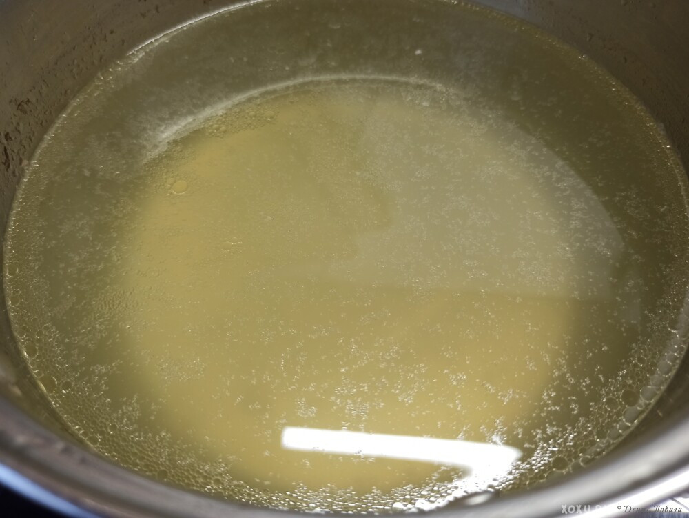 - В эмалированную кастрюлю заливают воду и бульон, добавляют кокосовое молоко и соус биск, а потом ставят на плиту и отваривают десять минут после закипания.