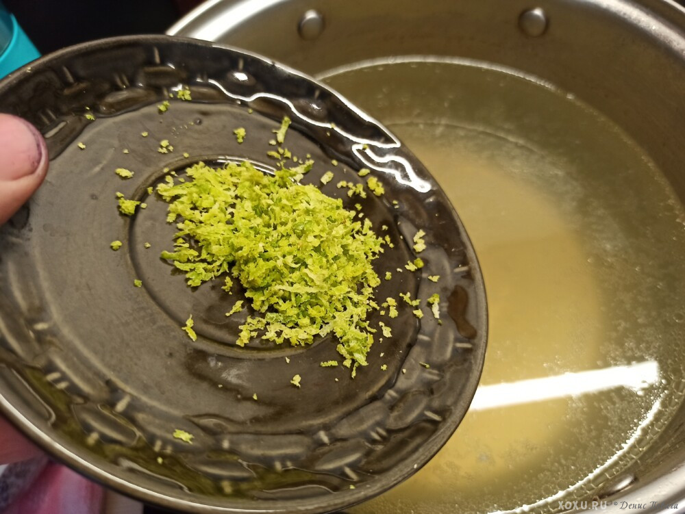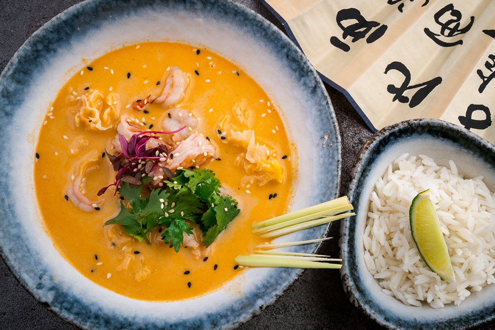 В кастрюлю влить рыбный бульон, добавить приготовленную ранее пасту (зажарку), цедру лайма (можно заменить на лимон) и томить еще 25 минут. На кухне должен появиться ощутимый пряный аромат — в этот момент стоит забросить грибы, нарубленную мелко кинзу. Через 10-15 минут супчик снимают с огня, заправляют соком лайма и кокосовым молоком. По вкусу посолить и добавить сахар для балансировки вкуса.