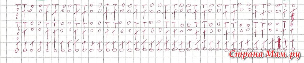 Основной узор: вяжется по сх. 2. Нач. с п. перед рапп., повтор. пет. рапп., заканчив. п. после рапп. Выполняем 1 раз с 1 по 7 рр., далее повтор. 2-7 рр
