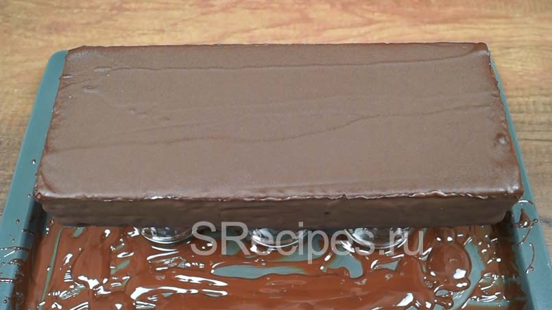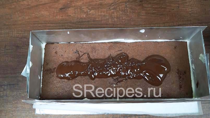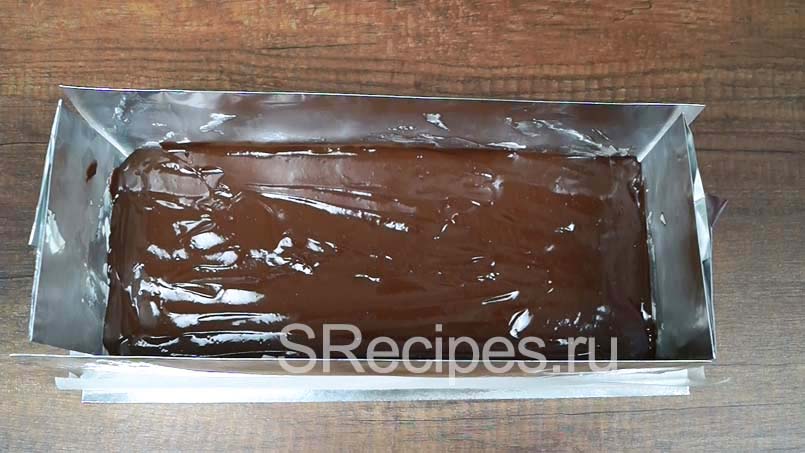 Выливаем растопленный шоколад и лопаткой выравниваем поверхность, чтобы получился тонкий ровный слой и все бока были покрыты шоколадом.