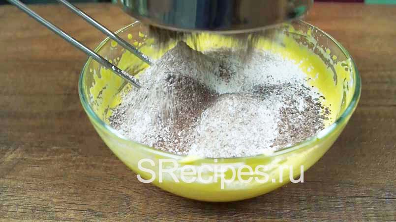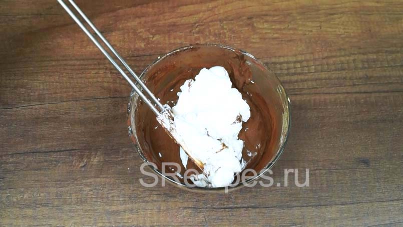 - Желтки взбейте с водой и сахарозаменителем, а затем добавьте в эту смесь все оставшиеся сухие ингредиенты. Теперь аккуратно домешайте белковую пену.