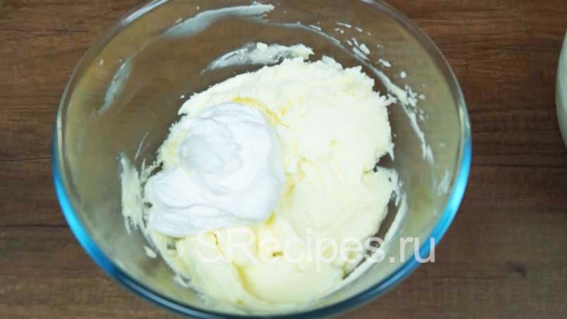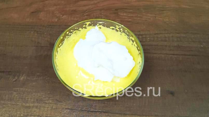 Шаг 2: В отдельной миске взбить белки со щепоткой соли до густой пены. 1/3 часть белков выложить в миску со взбитым маслом и сметаной, перемешать. Добавить разрыхлитель и постепенно всыпать муку в 3-4 приема. В самом конце добавить оставшиеся белки и перемешать.