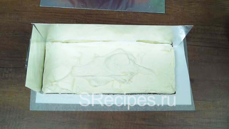 Приставляем их к бокам, заполняем кремом углы, выравниваем поверхность и ставим на час в морозилку.