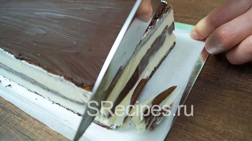 Влить в шоколад подсолнечное масло и растопить в микроволновке. Должна получится жидкая масса без комочков. Даем слегка остыть и достаем из морозилки полностью застывшее пирожное.