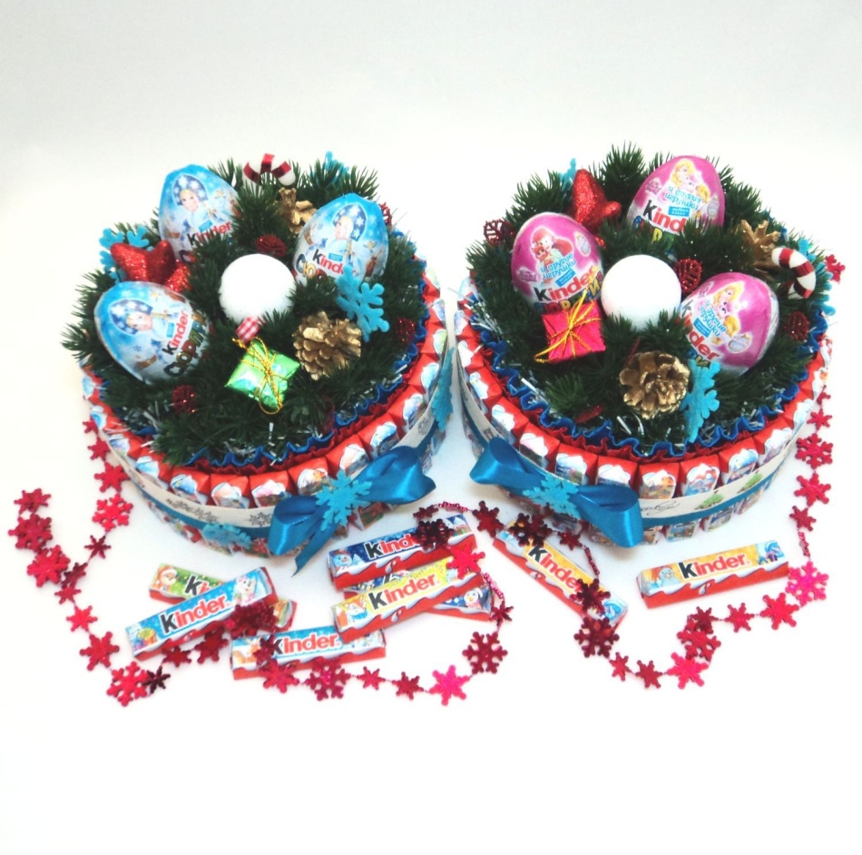 Для детской сладкой конструкции чаще всего используются маленькие плиточки Киндер-сюрприз или любые шоколадные батончики. Необычный сладкий сюрприз приведет в восторг как мальчика, так и девочку. При желании лакомую конструкцию можно украсить мягкими игрушками, куклами, фигурками любимых героев мультфильмов.