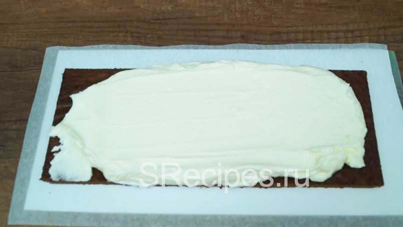 Теперь соберем огромное пирожное Киндер Пингви, на пергаментную бумагу кладем один коржик, сверху выкладываем половину крема и немного выравниваем поверхность.