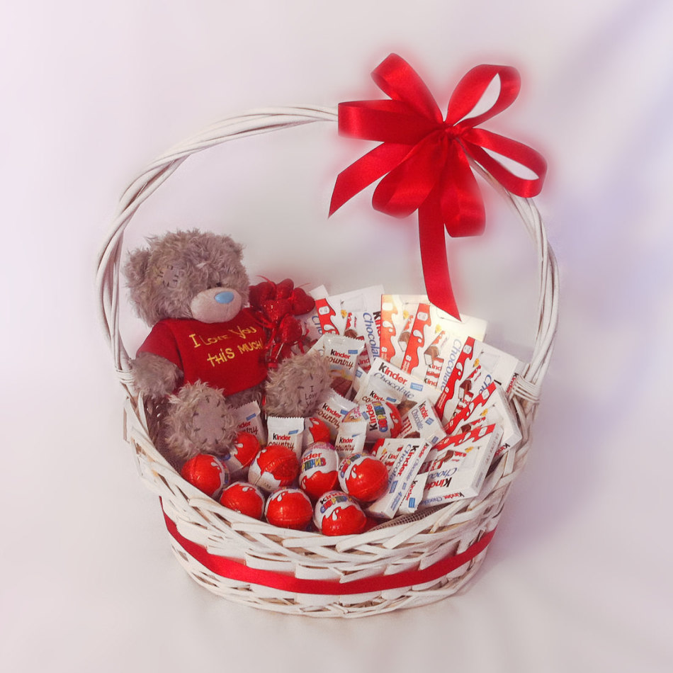 - Выкладываем наши киндеры в корзинку. Ее тоже можно украсить ленточками и рюшами.
