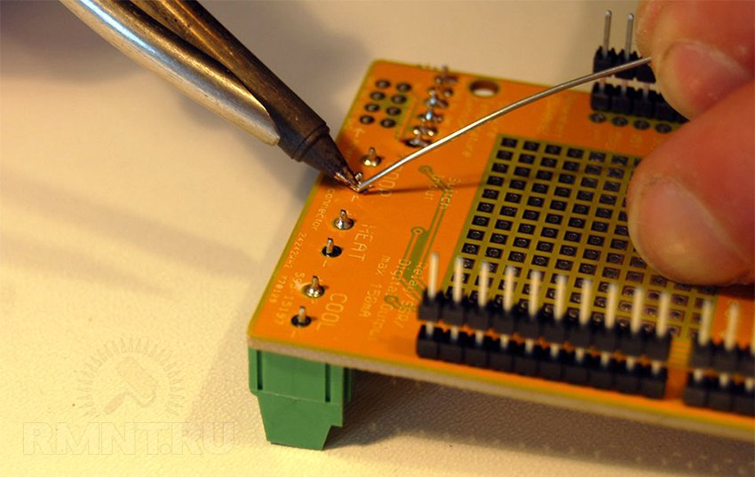 Прикасаемся, и припой растекается по ножке, заполняя при этом и отверстие. Так пропаиваем все ножки радиоэлемента (провода).