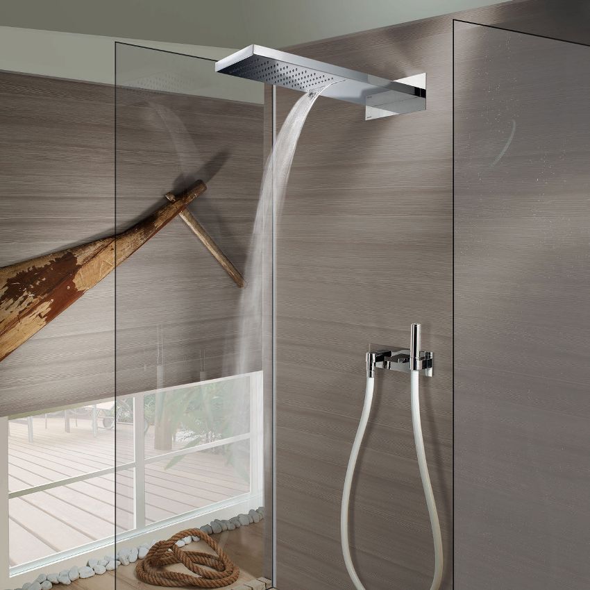 Самый дорогостоящий вариант, но при этом и самый эффектный. Устройство представляет собой панель, из которой собственно и льется вода. Форма и размер данного аксессуара могут быть различными. Его уникальная особенность заключается в том, что он монтируется непосредственно в потолок или стену.