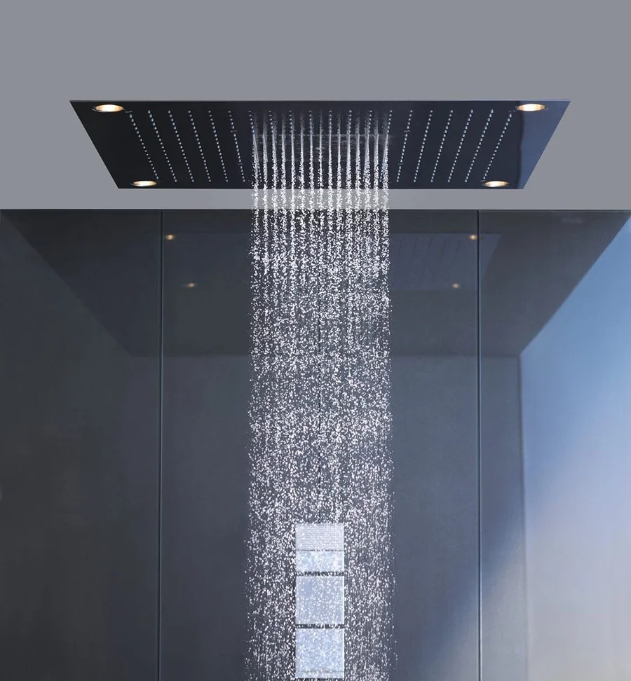 Главная отличительная особенность этой системы – лейка увеличенного размера. Именно в ней происходит распределение воды. Она изготавливается круглой, квадратной, прямоугольной, оснащается форсунками, часто дополняется подсветкой. За счет аэрации происходит разделение потока на множество капель, насыщенных пузырьками воздуха, направление падения которых обычно строго вертикальное.