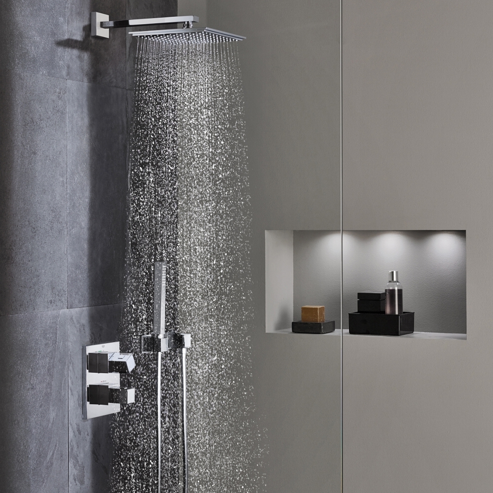 Такой вариант можно вмонтировать как в душевой кабине, так и в ванной. Возможно, придется обратиться к специалистам, так как сделать скрытый монтаж системы для новичка может быть проблематично. Вам же останется только наслаждаться приятной процедурой, которая поможет восстановить силы.