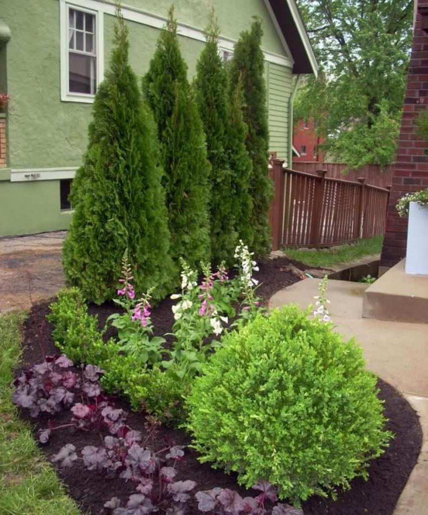 Часто встречающаяся на загородных участках композиция с участием хвойных растений – несколько вариантов оформления туи в окружении цветов и декоративных трав