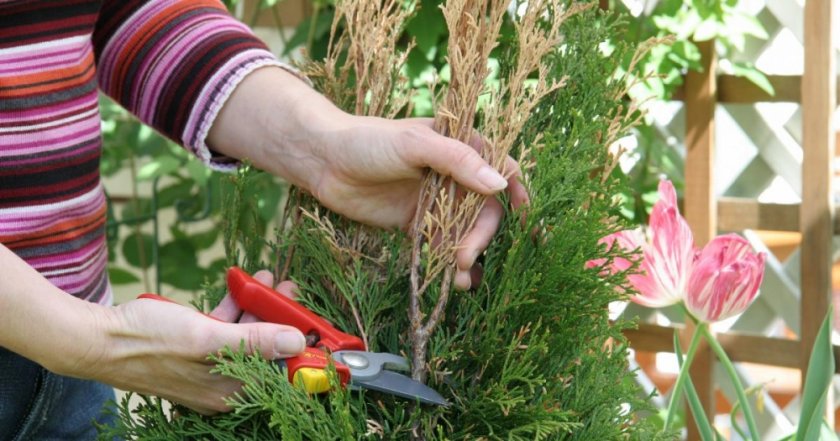 Обрезка туи может проводиться с целью удаления засохших и больных ветвей, а также ради придания кроны необходимой формы.