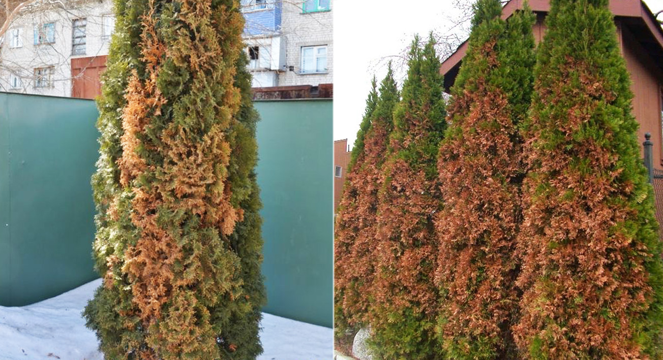 После зимы при отсутствии укрытия или раннего снятия лутросила туя желтеет при солнечном ожоге. Лучи, отражаясь от снега, воздействуют на нежную хвою и повреждает ее.
