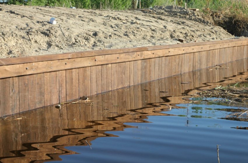 Технология укрепления берега дубовыми или сосновыми сваями ничем не отличается от применения лиственницы, за исключением долговечности конструкции. Дополнительная обработка древесины влагоотталкивающей пропиткой малоэффективна: со временем материал повреждается в результате соприкосновения с водой и от нашествия вредителей.