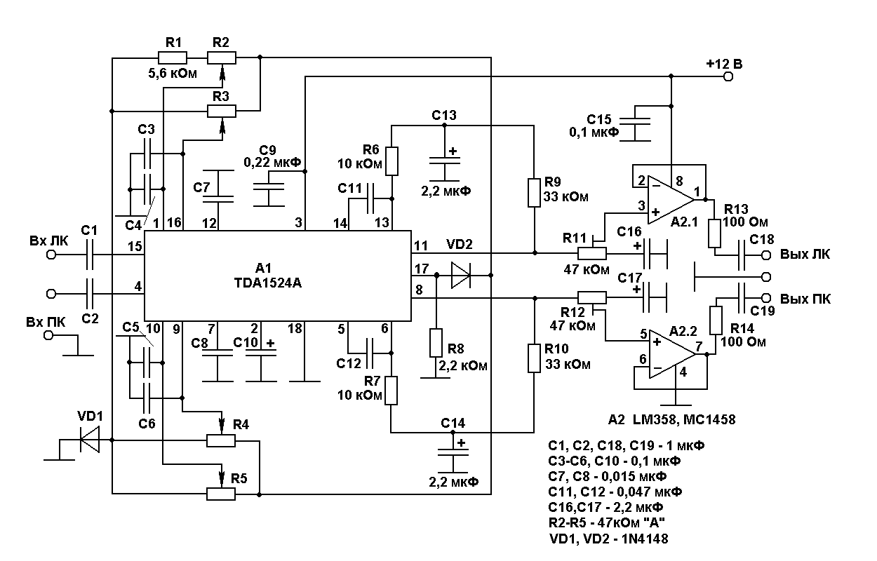 На глаза попалась схема усилителя для наушников, которая называлась «Блок регулирования громкости и тембра для стереонаушников». (Автор — Анджей Космински, Hobby Elektronik, №2/2000, c. 48–49). Сами регуляторы громкости и тембра выполнены на микросхеме А1 — TDA1524A в типовой схеме включения. (Так было написано в журнале, в оригинальном описании на микросхему схема немного другая. Но здесь схема приводится именно в «опубликованнном» виде).