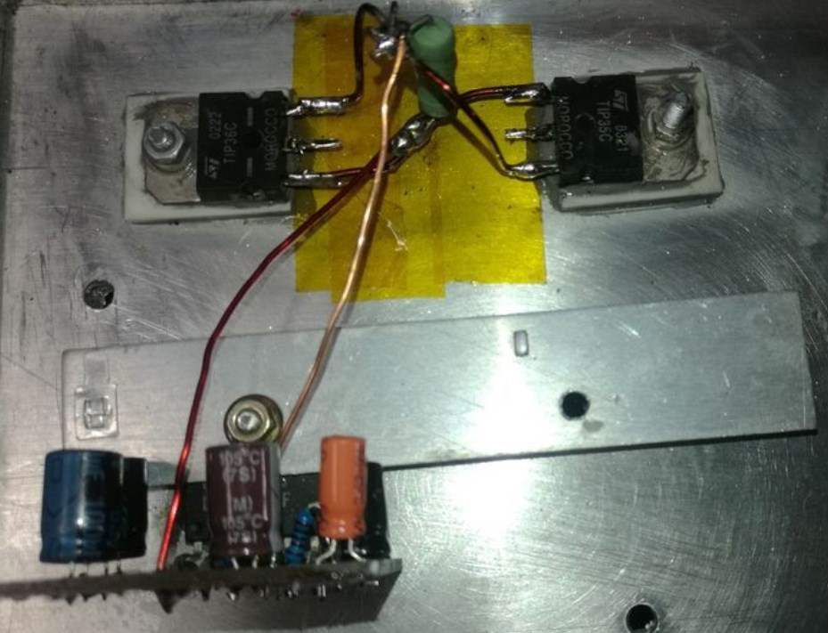 Из недостатков: столкнулся с проблемой фона переменного тока. Для меня так и осталось загадкой почему в схеме на пяти транзисторах емкости в 4700мкФ достаточно, а в этой схеме явно мало. Пришлось разориться и купить два конденсатора на 15000х63 вольта. Мне эти, казалось бы простые детали обошлись в 1500 рублей. Конечно можно было собрать батарею из конденсаторов на 2000мкФх50в, коих полная коробка, но они старые советские и в разы больше импортных, размер бы вышел в пол корпуса самого усилителя.
