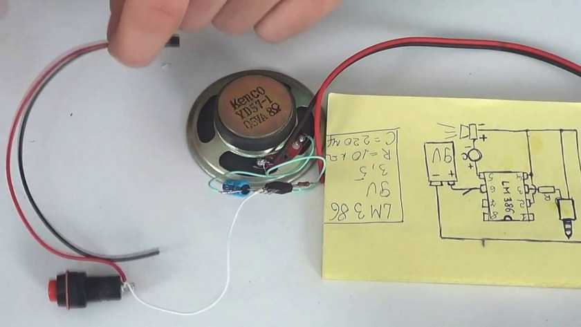 Во-первых, нам нужен разъем для кроны, крона на 9 вольт, один динамик, мощностью 1 Вт и сопротивление 8 Ом. Кроме этого также нужен один мини-джек на 3,5 мм, один резистор на 10 ом, переключатель, микросхема LM386 и один конденсатор на 10 В и 220 MF. Схема была нарисована на листе бумаги.