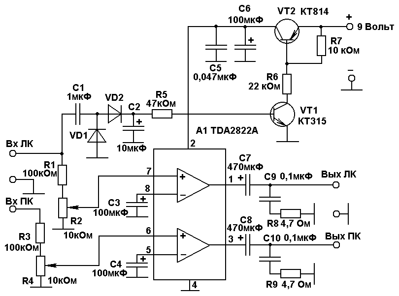 Питание усилителя осуществляется от 9-ти вольтовой батареи («Кроны», например). При отсутствии звукового сигнала напряжение на выходе детектора уменьшается до нулевого, транзисторы закрываются и микросхема обесточивается. Усилитель для наушников работоспособен при напряжении питания от 1,8 до 15 Вольт.