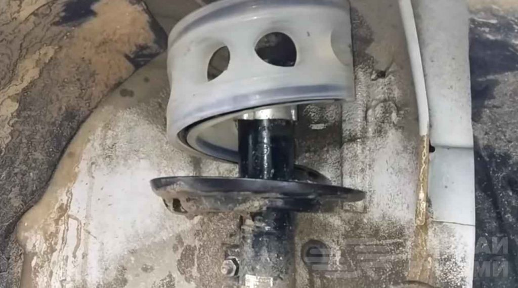 для удобства работы лучше снять колесо, но это не обязательно. Когда доступ к виткам пружины получен, необходимо удалить любые загрязнения и нанести небольшое количество силиконовой смазки или же мыльного раствора;