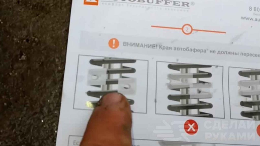 Первым делом необходимо примерить автобаферы, и при необходимости отрезать часть, чтобы все стало четко. Потом автобафер устанавливается на саму пружину. Нужно, чтобы пружина села плотно в специальные пазы.