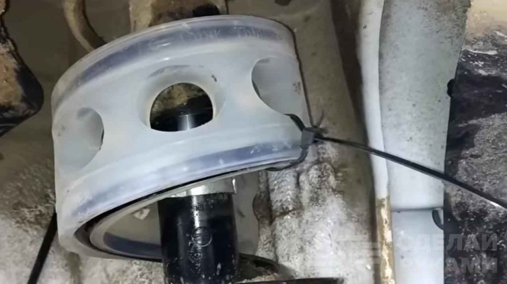 Дополнительно элемент фиксируется при помощи пластмассовых стяжных хомутов. Если часть куска заходит на второй виток, отрезаем лишнее при помощи канцелярского ножа. Несоответствие длины может увеличить нагрузку на часть пружины. Но что делать, если вы специально приобрели высокий автобафер с целью увеличения клиренса, и он не влезает в пружину? Для этого рекомендуется снять нижнее крепление амортизатора. Так ход пружины на рычаге подвески будет максимальным. При необходимости воспользуйтесь минусовой отверткой (в качестве рычага при установке подушки). После установки закрепите обратно колесо, опустите автомобиль и закрутите болт крепления нижнего сайлентблока амортизатора.