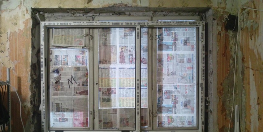 Производим демонтажные работы. Тут всё более-менее просто: снимаем створки, сбиваем откосы, удаляем подоконник, перепиливаем боковую стойку рамы, монтировкой складываем коробку и выдёргиваем её. Далее следует полностью освободить проём до несущих конструкций
