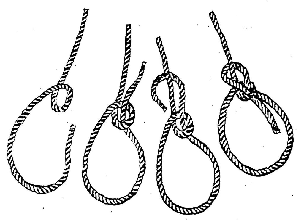 Удавка на опоре вяжется следующим образом: канат охватывает опору, входит в петлю и оборачивается вокруг нее 3 раза, затем проходит в малую петлю. Даже если веревка мокрая, образуется устойчивое соединение, которое можно использовать и без опоры.