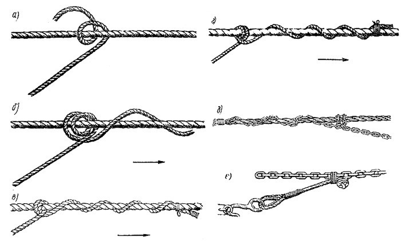 Для цепей применяют специальный стопор, который состоит из короткого троса с гаком и кнопом на концах. Этот стопор крепят к цепи при помощи линя (рисунок е).