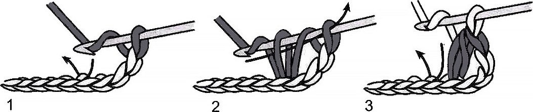 3 р.: 1 БН, прибавочная петель (ПП). В результате — 11 БН.