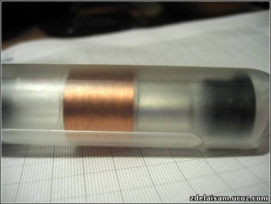 Четыре соединенных неодимовых магнита кидаются в трубу, а ее конец запечатывается вторым кругляшком. На один из концов трубы приклеивается светодиод без отражающих бортиков. На шайбе со стороны светодиода делаются две прорези, куда прикрепляется проволока.