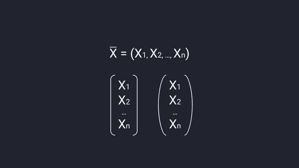 Вектор можно записать в строку или в столбец. Для строчной записи вектор обозначают одной буквой, ставят над ней черту, открывают круглые скобки и через запятую записывают координаты вектора. Для записи в столбец координаты вектора нужно взять в круглые или квадратные скобки — допустим любой вариант.