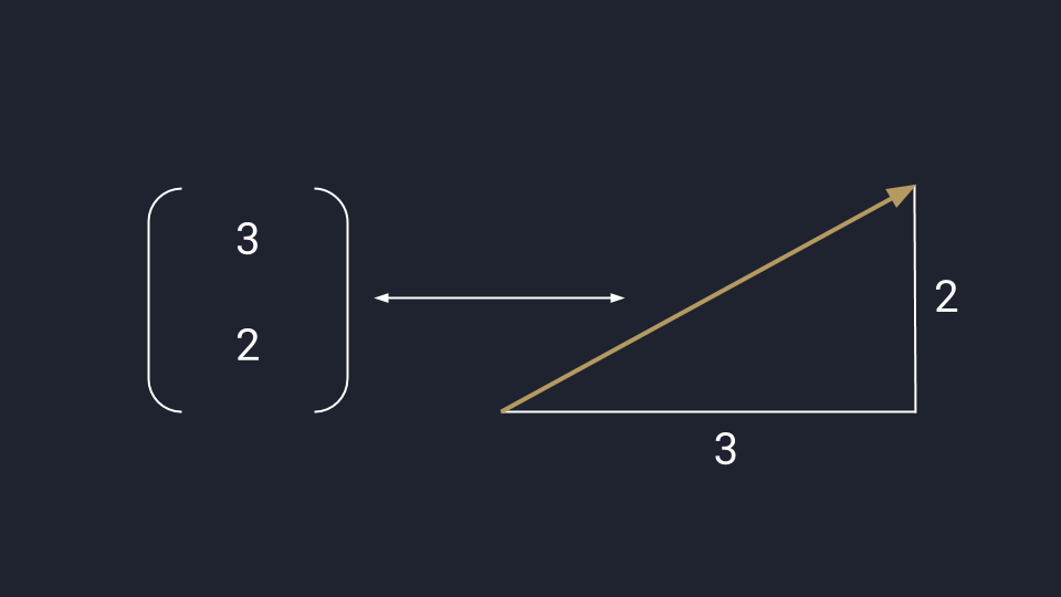Вектор из двух чисел отображается в виде точки на плоскости осей Х и Y. Числа задают координаты вектора в пространстве — это такая инструкция, по которой нужно перемещаться от хвоста к стрелке вектора. Первое число показывает расстояние, которое нужно пройти вдоль оси Х; второе — расстояние по оси Y. Положительные числа на оси Х обозначают движение вправо; отрицательные — влево. Положительные числа на оси Y — идём вверх; отрицательные — вниз.