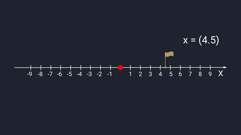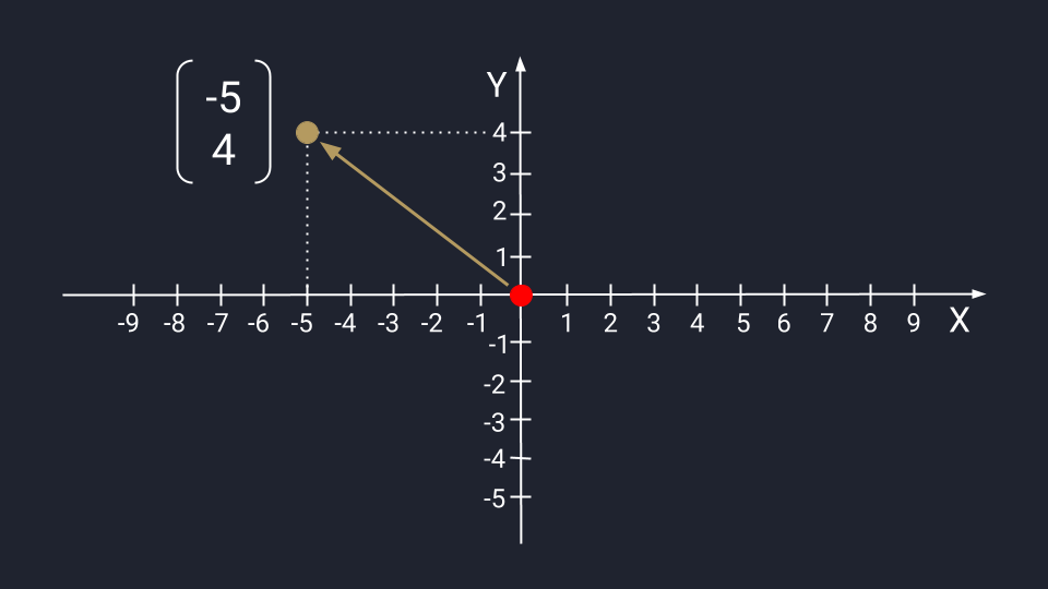 Представим вектор с числами −5 и 4. Для поиска нужной точки нам необходимо пройти влево пять шагов по оси Х, а затем подняться на четыре этажа по оси Y.