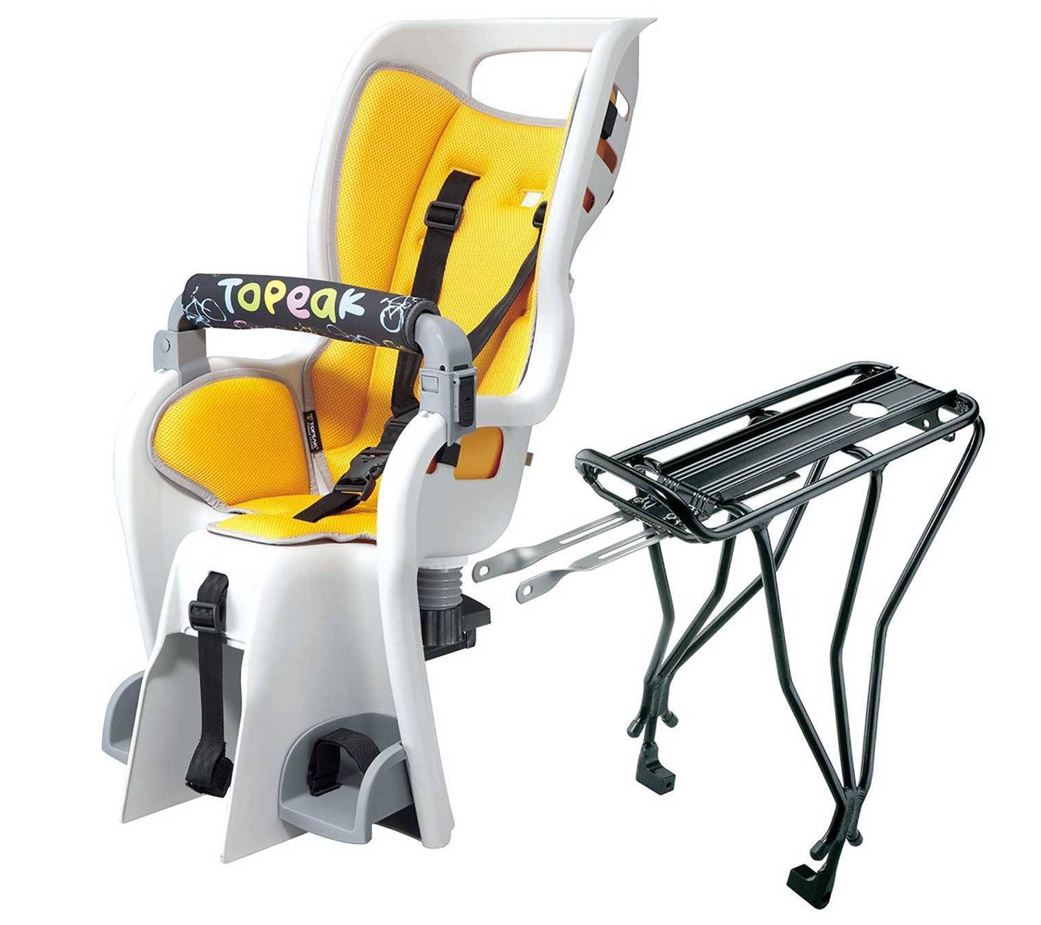 Детское кресло Topeak BabySeat II. Такое велокресло устанавливается за несколько минут, за счёт механизма крепления. В наличии имеются 6-точечные ремни безопасности, мягкая основа сиденья и спинки, настраиваемые подножки и прочный корпус создают эффект кокона. Преимуществом данного детского кресла на багажник велосипеда является подпружиненное сиденье. Кресло выдерживает ребёнка не старше семи лет.