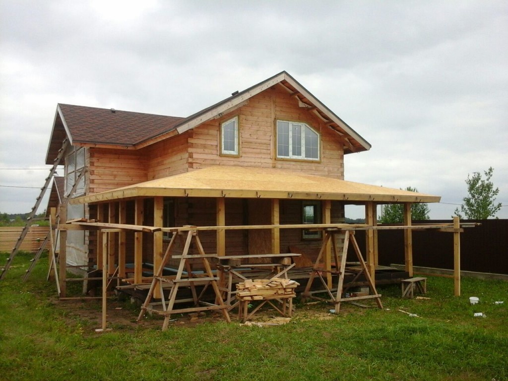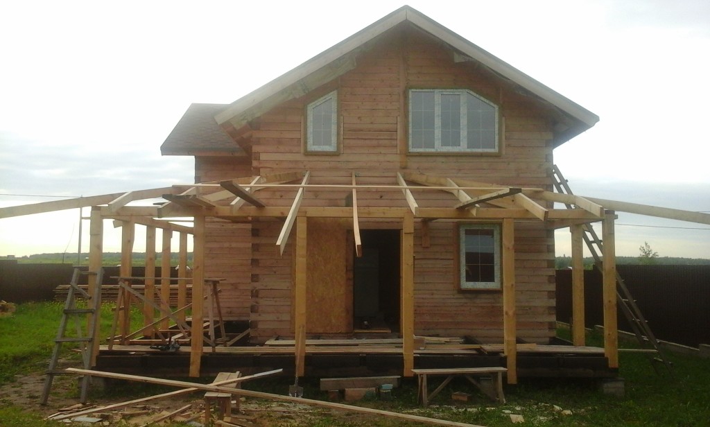 После постройки каркаса приступают к монтажу стропильной системы. Для стропильной системы веранды используется та же доска 150*50 мм, что и для стропил самого дома. Угол наклона крыши веранды должен соответствовать проекту. Если пристроить веранду к дому, было решено самостоятельно, и не предполагалось по проекту, то крышу не стоит делать слишком пологой, иначе под тяжестью снега она может привалиться.