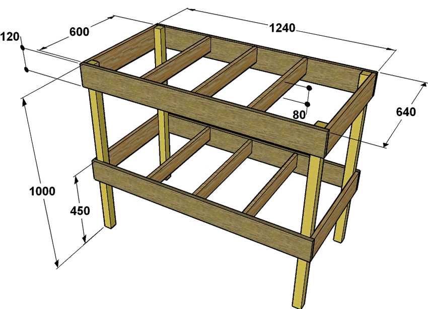 Согласно чертежу нарезают доски для изготовления нижней рамы, которая будет использоваться под инструменты. Соединяют пиломатериал между собой при помощи саморезов либо металлических уголков.