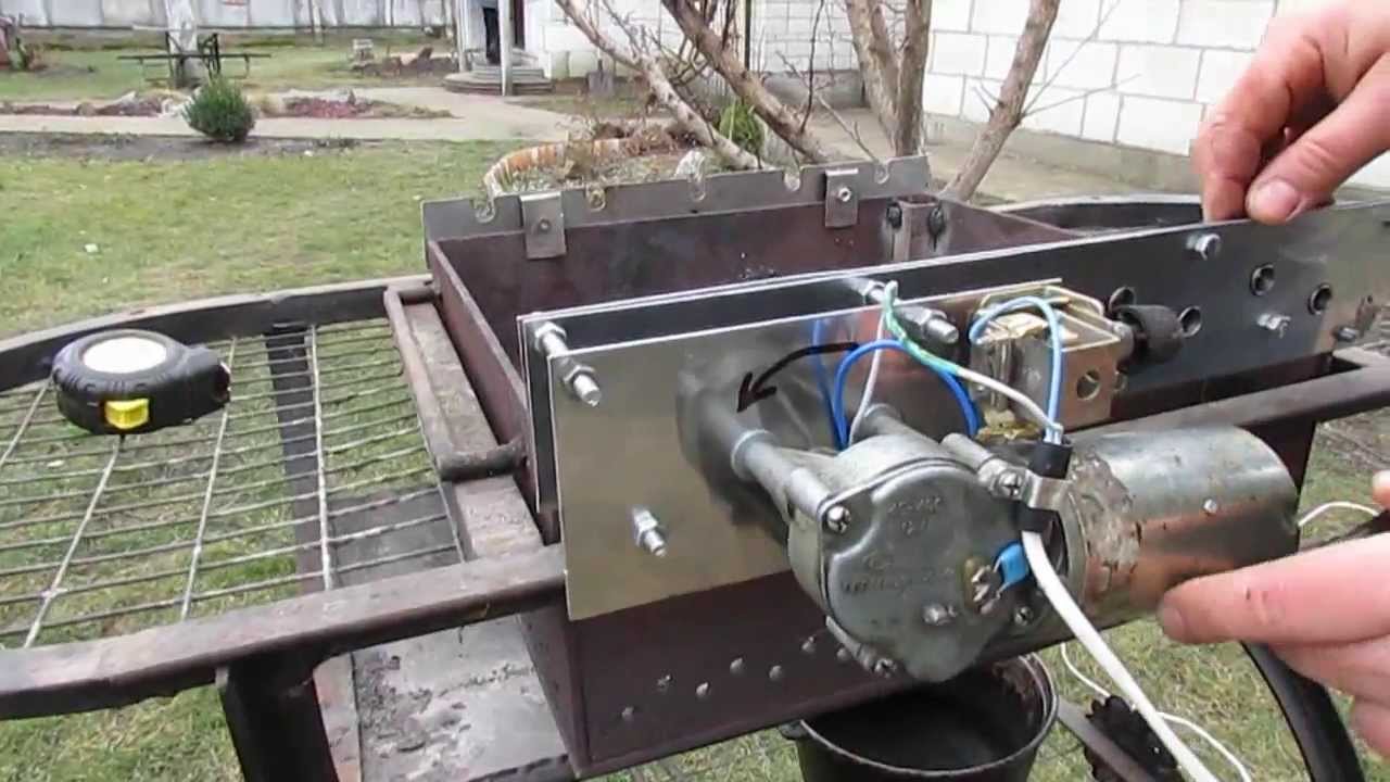 Оптимальный вариант — электродвигатель с питанием 12 В, обладающий достаточной мощностью для вращения шампуров, но не требующий чрезмерно емкого источника питания. Его можно подключать к бортовой сети автомобиля, использовать аккумуляторные батареи и т. д. Можно воспользоваться моторчиком от разных устройств, таких как: