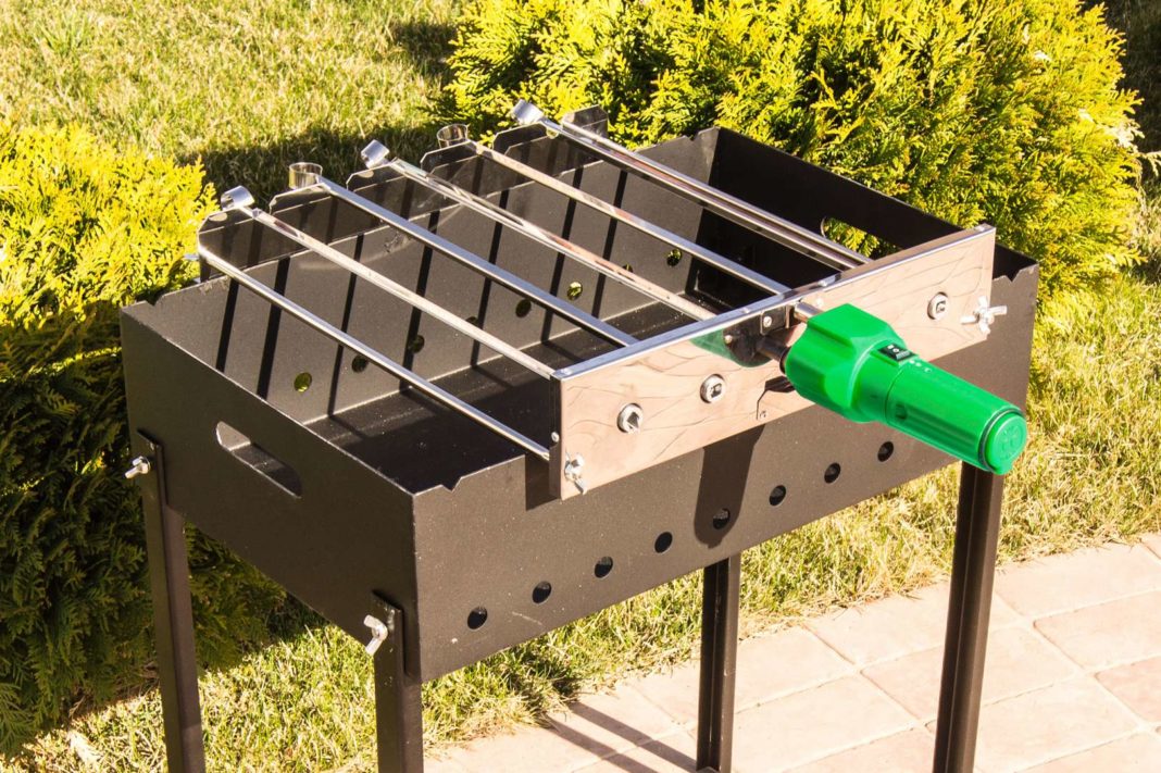 Представляет собой вертел для мангала, оснащенный электрическим двигателем, с ним нужно лишь засечь время приготовления, чтобы через установленный промежуток снять мясо с углей. Здесь не нужно вручную переворачивать заготовку, продукт равномерно прожаривается и сохраняет сочность, так как меньше вытекают жиры и соки.