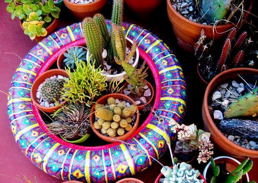 Яркие клумбы разной высоты, выполненные из автомобильных шин