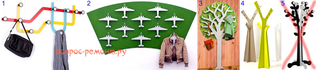 Тем не менее, приучать детей обращаться с вещами как надлежит нужно. Только детская вешалка, чтобы не вызвала явного психологического отторжения, должна выглядеть несколько неупорядоченной. Весьма желательно также, чтобы она ассоциировалась у ребенка с любимой игрой или увлечением. Примеры настенных вешалок в детскую типа «игра/хобби» даны на поз. 1 и 2 рис.