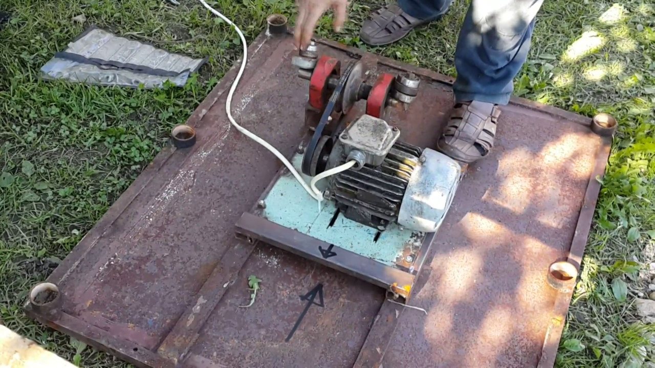 - установить двигатель на земле, выполняя передачу вращения посредством ремня на вал, снабженный эксцентриком (его крепят к плите на подшипниках).